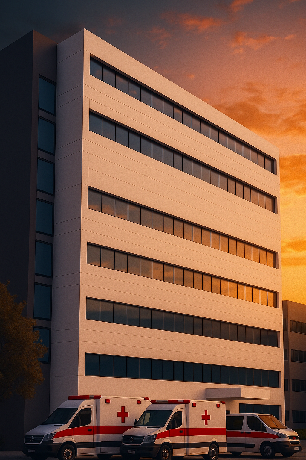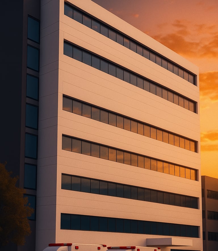 El complejo incluye una torre de consultorios médicos y áreas modernas equipadas con tecnología avanzada para servicios de diagnóstico, urgencias, hospitalización y atención especializada. El edificio presenta una infraestructura amplia y funcional, diseñada para brindar atención médica integral en un entorno urbano.